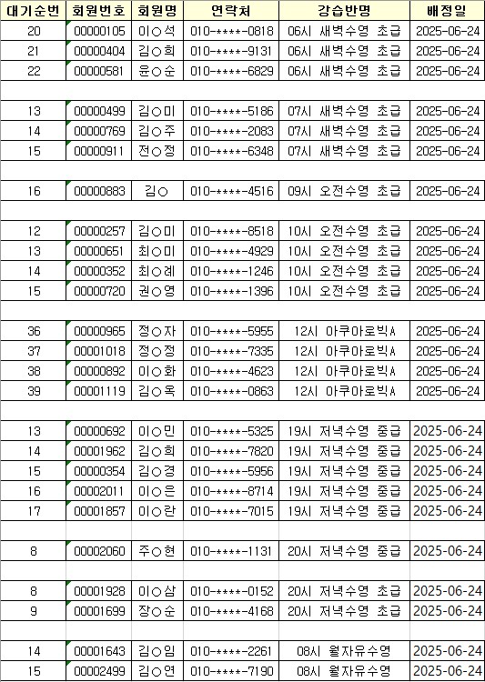 7월 강습 및 자유수영 추가 당첨자 명단 안내(6월 24일 당첨자)